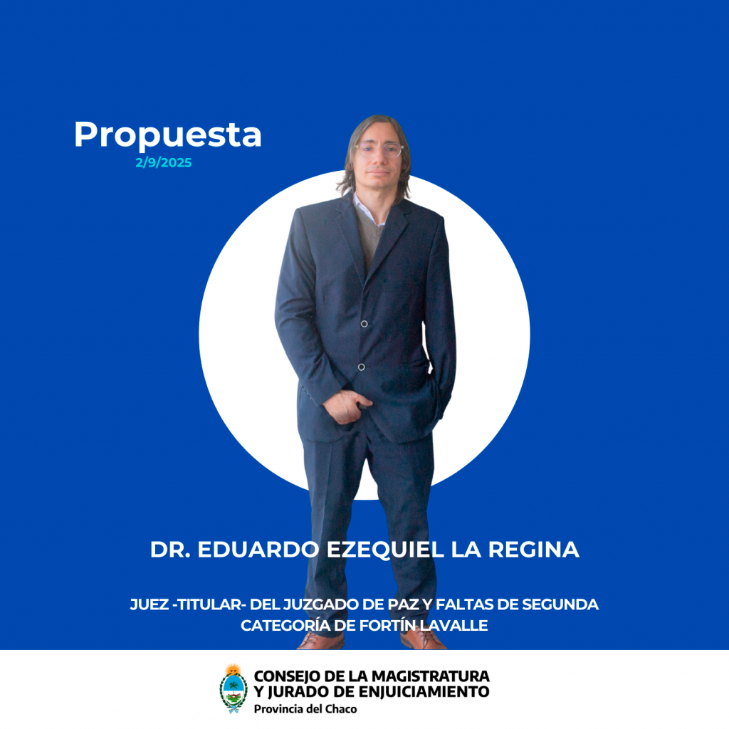 Al Dr. Eduardo Ezequiel La Regina por unanimidad, para ocupar el cargo de Juez Titular del Juzgado de Paz y Faltas de Segunda Categoría de Fortín Lavalle, con asiento en Villa Río Bermejito.