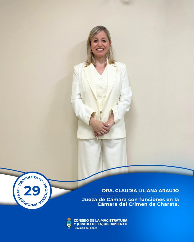 • Cargo de Jueza de Cámara con funciones en la Cámara del Crimen de Charata.: Por unanimidad fue propuesta la Dra. Claudia Liliana Araujo