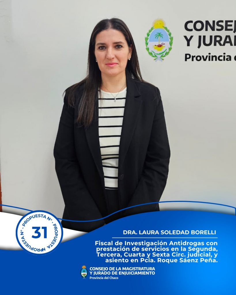 • Cargo de Fiscal de Investigación Antidrogas con prestación de servicios en la SEGUNDA, TERCERA, CUARTA Y SEXTA Circunscripción judicial, y asiento en Presidencia Roque Sáenz Peña. La Dra. Laura Soledad Borelli fue propuesta por mayoría con los votos de María Cecilia Arroyo, Ricardo José Urturi, Jorge Fernando Gómez, Carmen Noemí Delgado y Víctor Emilio del Río. El consejero Sergio Andrés Bosch votó en favor del Dr. Julio César Espíndola y el Consejero Rubén Omar Guillón votó por la Dra. Andrea Verónica Bastos.