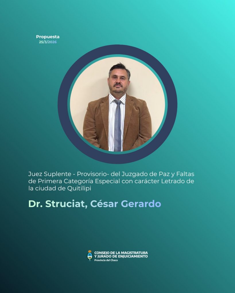 Por otra parte, informaron que cerró la inscripción para cubrir el cargo de Juez -Suplente- del Juzgado de Paz y Faltas de Primera Categoría Especial con carácter Letrado de la ciudad de Quitilipi.