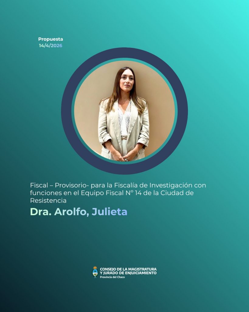 - Fiscal -Provisorio- para la Fiscalía de Investigación con funciones en el Equipo Fiscal Nº14 de Resistencia, Dra. Julieta Arolfo, con los votos de Víctor Emilio del Río, Rubén Omar Guillón, Jorge Fernando Gómez, Carolina Beatriz Meiriño, Ricardo José Urturi y María Cecilia Arroyo. Asimismo, Sergio Andrés Bosch votó por la Dra. Natalia Paola Radovancic.