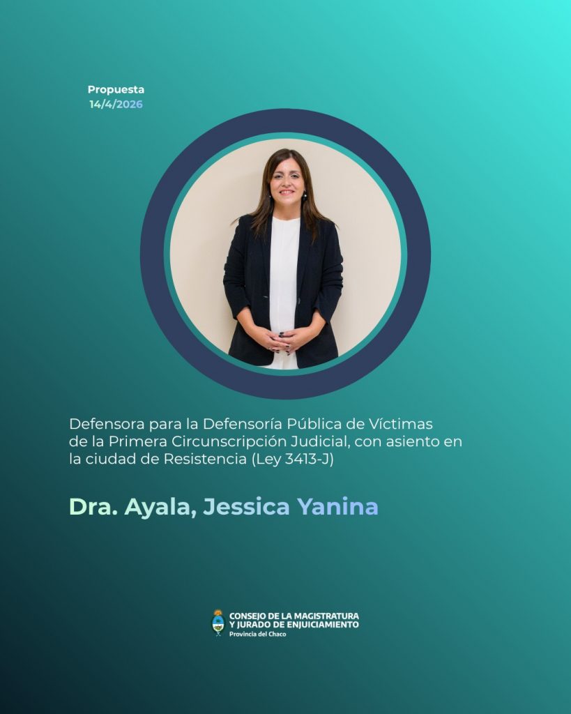- Defensora para la Defensoría Pública de Víctimas de la Primera Circunscripción Judicial con asiento en Resistencia, Dra. Jessica Yanina Ayala, con el voto Unánime de los consejeros.