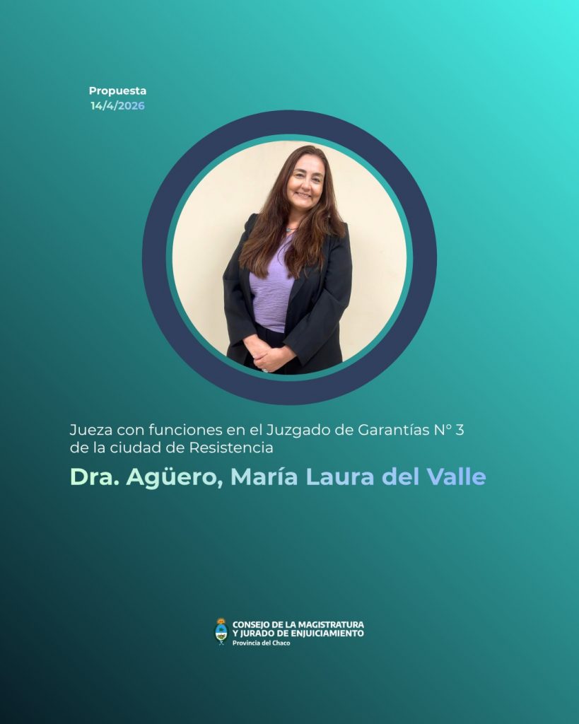 - Juez con funciones en el Juzgado de Garantías Nº3 de Resistencia, Dra. María Laura Del Valle Agüero, con los votos de Víctor Emilio del Río, Jorge Fernando Gómez, Carolina Beatriz Meiriño, Ricardo José Urturi y María Cecilia Arroyo. Por su parte, Rubén Omar Guillón votó a favor de Alan Federico Feldmann y Sergio Andrés Bosch votó a favor de Esther Carolina Itatí Yagueddú Balmaceda Bargas.