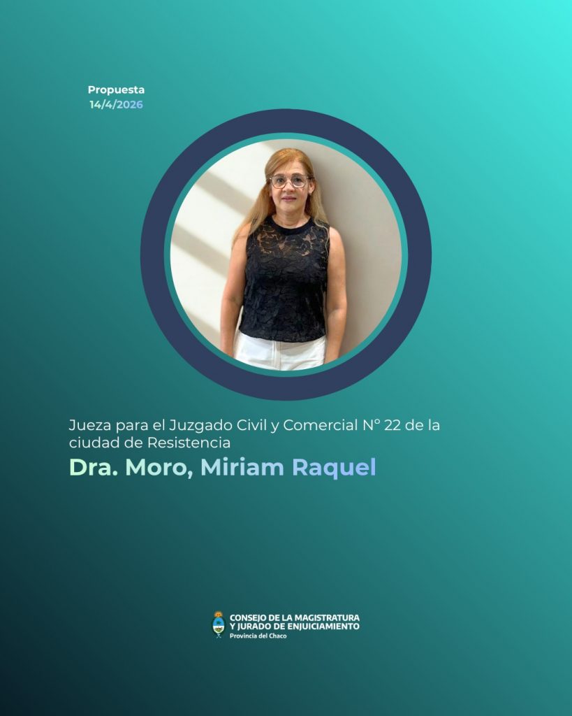 - Juez para el Juzgado Civil y Comercial Nº22 de Resistencia, por Unanimidad de los consejeros, fue propuesta la Dra. Miriam Raquel Moro.